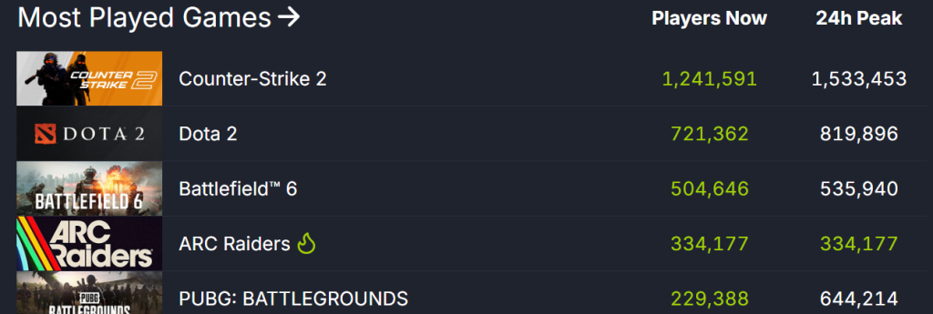 Шутер Arc Raiders от Embark Studios удивляет динамикой роста аудитории. По данным SteamDB, 2 ноября игра собрала 354 836 одновременных пользователей, что стало новым рекордом и закрепило ее в числе самых популярных проектов на платформе. Примечательно, что это уже третий день подряд, когда игра обновляет собственный максимум.