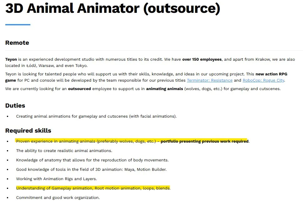 Студия Teyon, подарившая нам RoboCop Rogue City и Terminator Resistance, вовсю трудится над новой игрой, которая на этот раз сменит жанр со стандартного шутера на экшен-RPG. Информация об этом всплыла благодаря свежим вакансиям на официальном сайте разработчиков. Судя по требованиям к кандидатам, команда ищет специалиста по анимации животных, что дает первые зацепки относительно сеттинга и механик будущего тайтла.