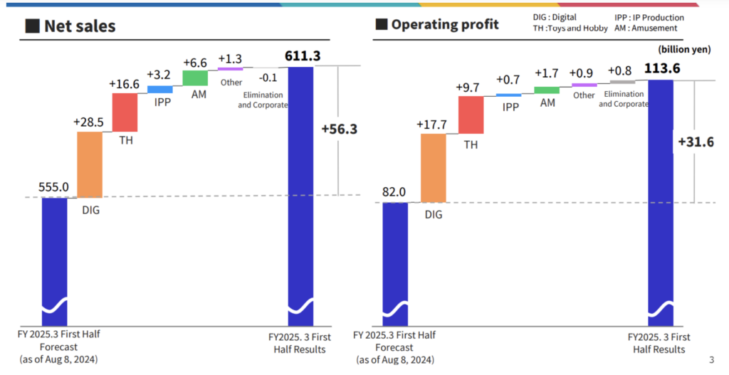 В первой половине 2025 финансового года чистая выручка Bandai Namco составила 611,3 млрд иен (3,96 млрд долларов США), что на 21,8% больше по сравнению с аналогичным периодом 2024 года.