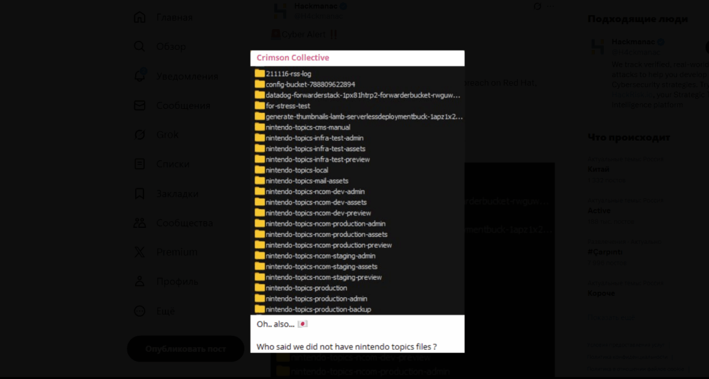 В социальных сетях появилось изображение, опубликованное хакерской группой Crimson Collective. На скриншоте якобы показана библиотека папок Nintendo, что означает у хакеров может быть доступ ко многим критически важным данным.