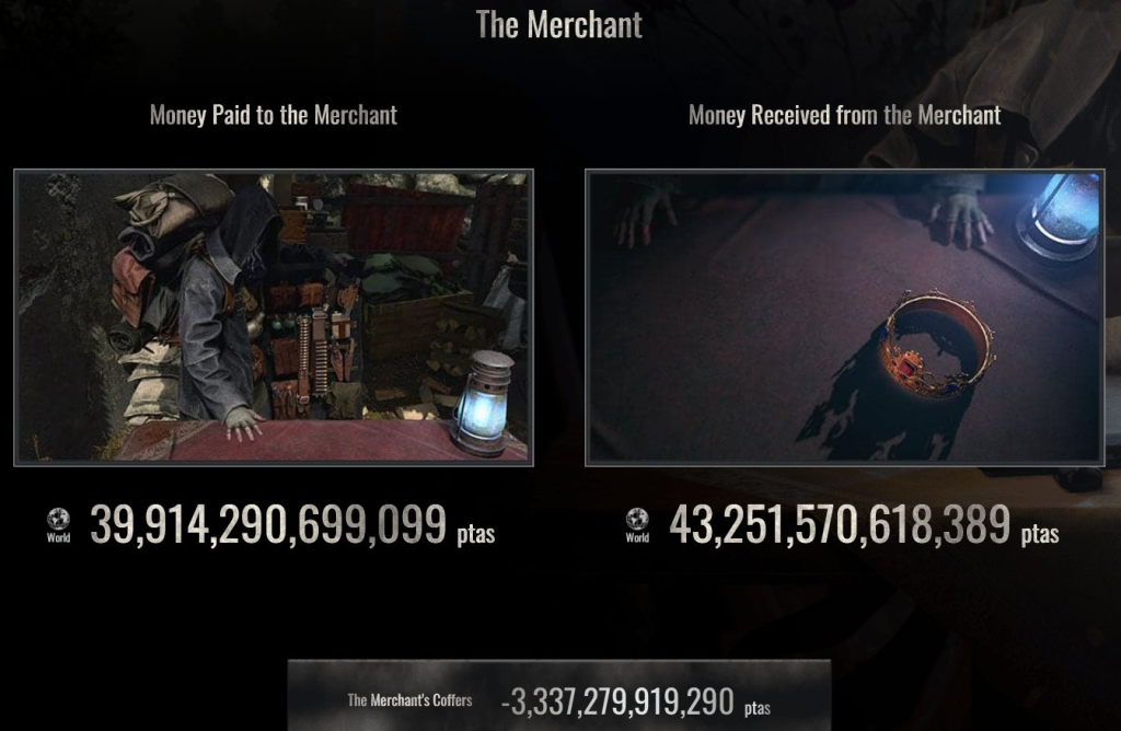 Оказалось, игроки со всего мира скупили у торговца оружия на без малого 40 миллиардов песет. Но при этом сдали ему сокровищ и антиквариата на 43,2 миллиарда песет. Что оставило торговца в минусе на 3,3 миллиарда песет!