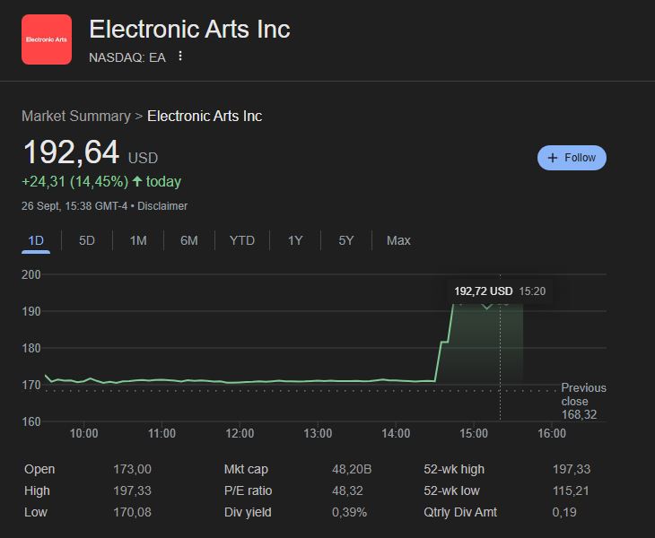 На фоне новостей об уходе EA с биржи акции компании выросли в цене на 15%.