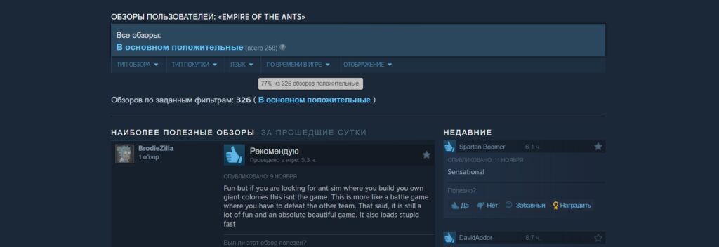 7 ноября состоялся релиз Empire of the Ants, кошмара инсектофобов и по совместительству RTS про муравьев. Игроки «в основном положительно» встретили новинку в Steam, уверено похвалив ее фотореалистичную графику и общий визуальный дизайн. Больше всего разногласий у пользователей вызвала оценка геймплея проекта: