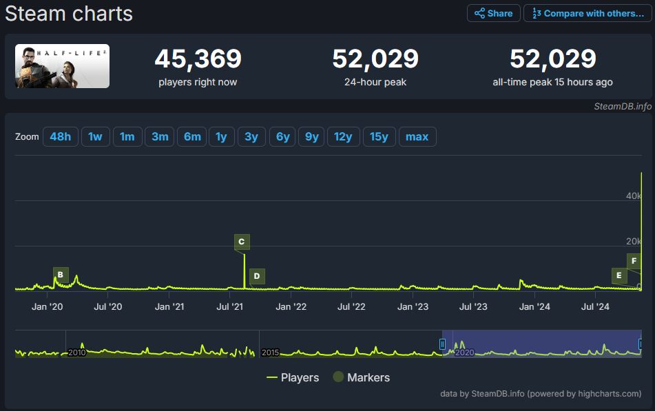 Фанаты массово вернулись в Half-Life 2 после недавнего юбилейного обновления. На момент написания статьи пиковый онлайн достиг 52 029 игроков. Это больше, чем когда либо с тех пор, как Valve начала отслеживать онлайн — то есть с 2008 года. Неплохо для проекта 20-летней давности!