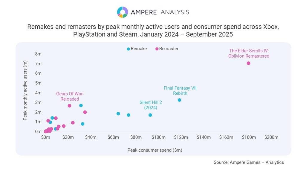 Аналитическая компания Ampere опубликовала данные о тратах геймеров на ремейки и ремастеры за последние два года, и оказалось, что геймерам не интересны «подтяжки» лица старых проектов. Они хотят обновленный игровой опыт. С января 2024-го по сентябрь 2025-го на Xbox, PlayStation и Steam вышло 42 переиздания — 15 ремейков и 27 ремастеров. Совокупная аудитория этих проектов составила 72,4 миллиона игроков, а общие траты на полные версии и внутриигровые покупки достигли 1,4 миллиарда долларов.