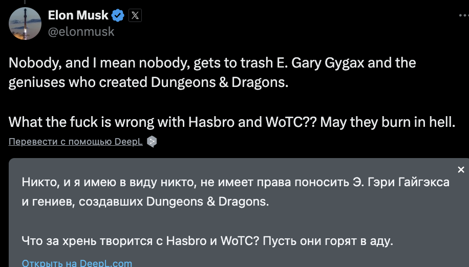 Маск выразил резкое несогласие в соцсетях, заявив, что такие гении, как Гайгэкс, заслуживают уважения. Он также обвинил Hasbro и Wizards of the Coast в неуважении к наследию D&D, сопроводив комментарии резкими выражениями.