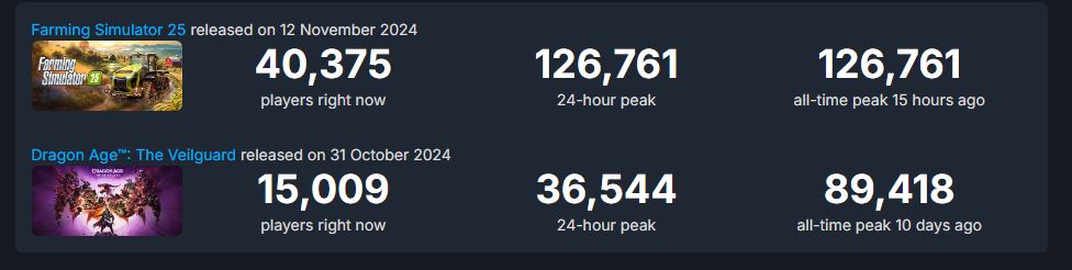Пиковый онлайн вышедшей 12 ноября Farming Simulator 25 быстро преодолел отметку в 126 тысяч игроков, оставив ту же Dragon Age: The Veilguard, в которую на пике играло чуть меньше 90 тысяч человек, далеко позади.