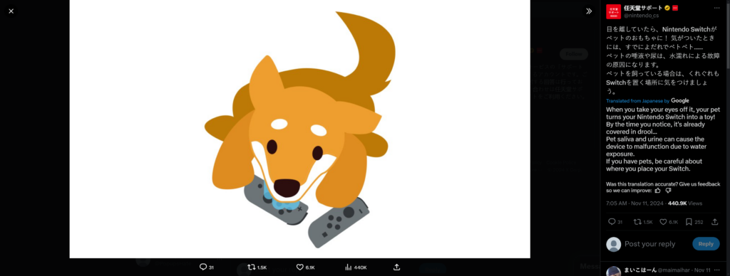 Nintendo в свободное от подачи исковых заявлений в суд выпускает не только игры, но и странные предупреждения для геймеров. Через официальный японский аккаунт техподдержки в соцсети X компания напомнила владельцам Nintendo Switch, чтобы они держали свои джойконы подальше от домашних животных. И дело не только в том, что они могут их погрызть.