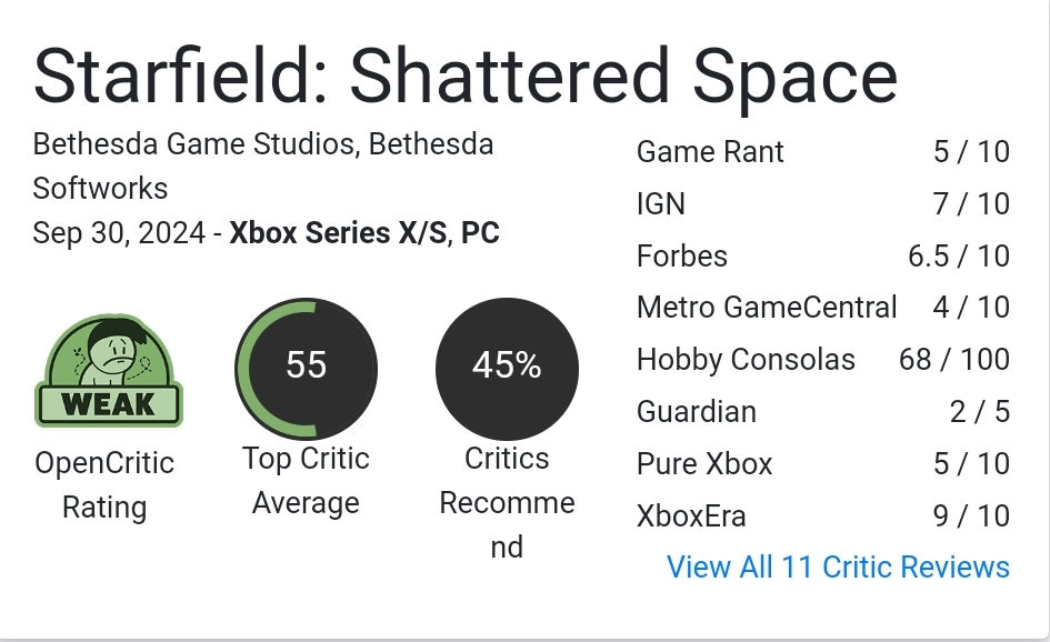Вышедшее дополнение для Starfield тонет в негативных отзывах критиков. Средний рейтинг Shattered Space на Opencritic составляет 55/100.