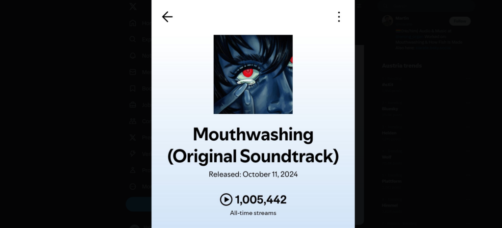 Мартин Халлдин, разработчик популярного инди-хоррора Mouthwashing, рассказал, что его саундтрек к игре пользуется большой популярностью в Spotify. Его прослушали миллион раз! Однако сильно богаче автор от этого не станет.