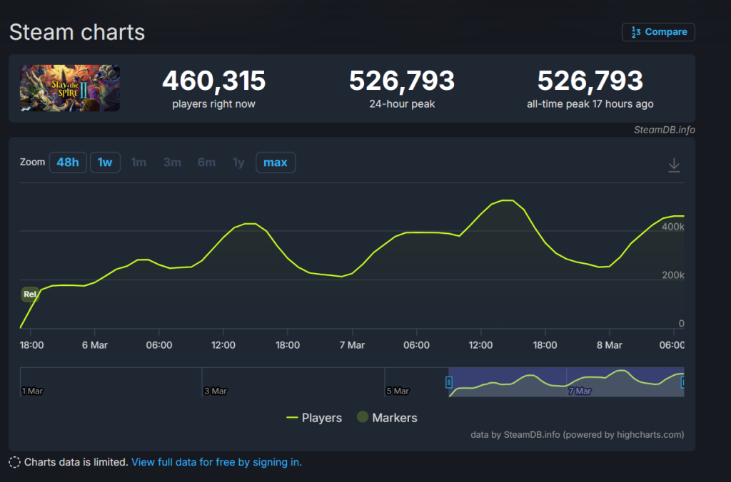 Slay the Spire 2 продолжает бить рекорды на выходных. Пиковый онлайн игры в Steam превысил полмиллиона игроков и на момент написания новости перевалил за 526 тысяч человек одновременно.