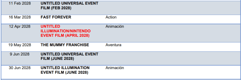 Согласно обновленному графику релизов Universal Pictures на испанском сайте студии, 12 апреля 2028 года выйдет некий пока безымянный анимационный проект совместного производства Illumination и Nintendo.