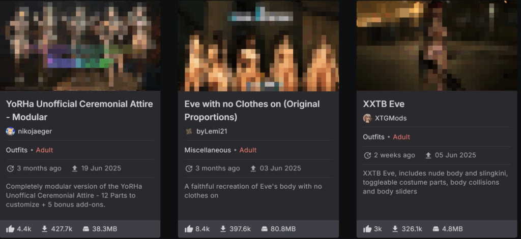 В топе модификаций для Stellar Blade по-прежнему доминируют работы откровенного характера: YoRHa Unofficial Ceremonial Attire (свыше 440 тысяч загрузок), Eve with no Clothes (около 410 тысяч) и XXTB Eve (более 320 тысяч). Помимо этого, популярны косметические моды, добавляющие новые варианты внешности и аксессуаров для главной героини.