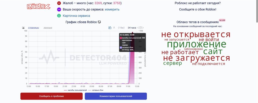 Пик жалоб на сбои пришелся на 12:00 сегодняшнего дня (3 декабря 2025 года): у игроков не загружается сайт либо не открывается приложение.