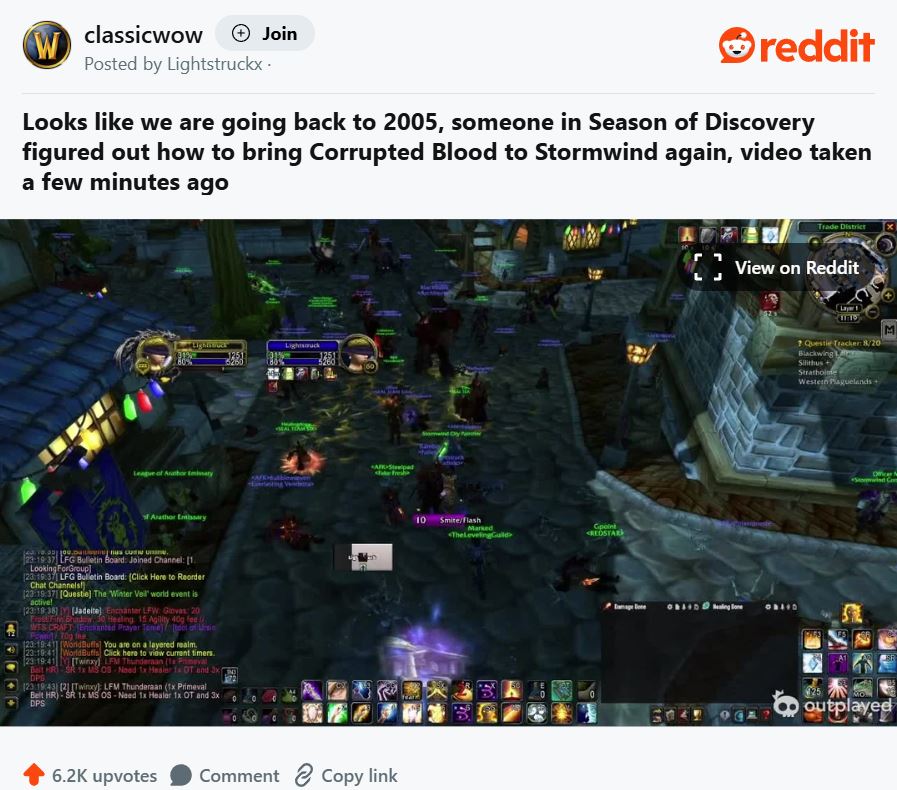 Несколько дней назад на Reddit появились кадры, на которых персонажи игроков из WoW Classic в столице Альянса распространяют между собой дебафф, получивший широкую известность в 2005 году.