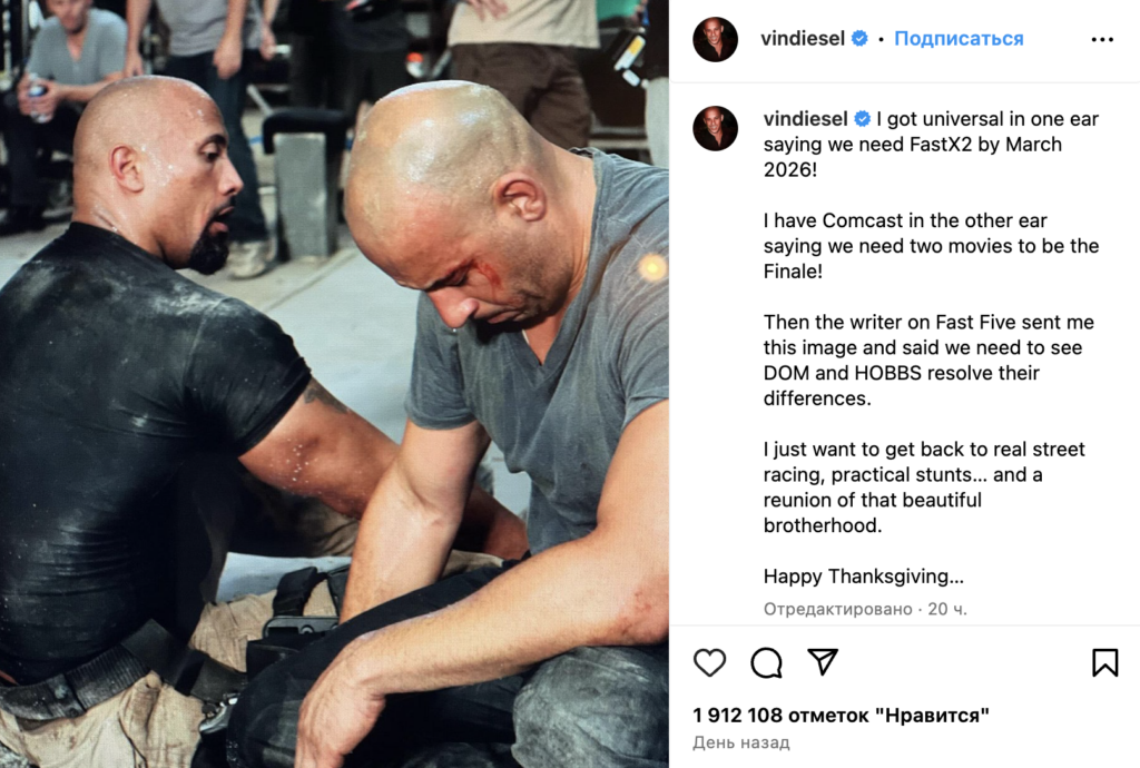 «Я просто хочу вернуться к настоящим уличным гонкам, практическим трюкам… и воссоединению этой прекрасной братской связи. С Днем Благодарения…», — пишет актёр в Instagram.