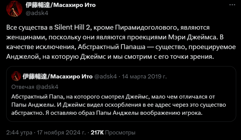 Давние поклонники серии знают, что существа в Silent Hill 2 — это не просто страшные монстры, а воплощение внутреннего мира Джеймса Сандерленда. Его вина за случай с женой и сложные чувства к ней оживают в форме жутких созданий. Но теперь Ито окончательно пролил свет на то, что женский облик большинства из них тоже не случаен. Они — своего рода искаженные образы Мэри.