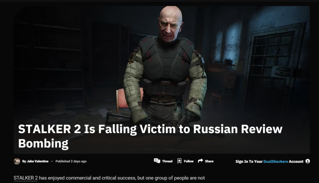 На днях мы наткнулись на заметку издания DualShockers с заголовком «STALKER 2 становится жертвой российского ревью-бомбинга». Автор обвинил русских игроков в падении рейтинга игры в Steam и заявил, что отечественным геймерам платят деньги за негативные обзоры. Разумеется, никаких доказательств не предоставил и предложил поверить ему на слово.